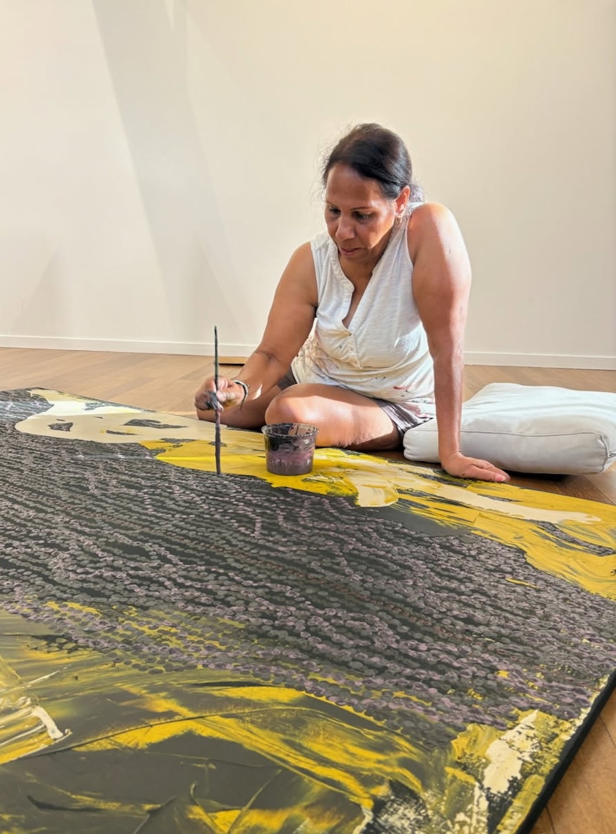“Painting from memory has probably been one of my strengths. When I paint I can picture myself being out on Country and I remember the landscape. I’m able to share this not just with my kids and my family, but with everyone. Living in the outback and not taking the time to see what it has to offer - it is something that we all forget to appreciate. Being out on Country keeps me grounded to my culture and to my home.”